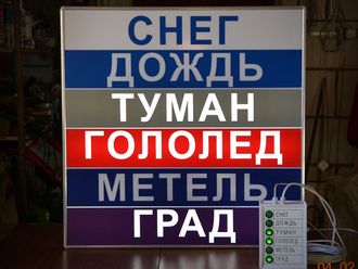 Световое табло погодных условий " СНЕГ, ДОЖДЬ, ТУМАН, ГОЛОЛЕД, МЕТЕЛЬ, ГРАД" с пультом переключения на 6 каналов (размеры 800 х 800 мм)