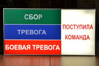 Предназначено для оповещения личного состава, населения об уровне военной опасности. Основные заказчики - силовые ведомства, режимные учреждения. Информация на табло подсвечивается поканально и соответствует одному из выбранных уровней военной опасности. Готовое решение для использования как внутри помещений так и на открытых площадках.