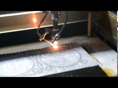 Резка производится СО2 лазером с точностью до 0,01 мм. Материалы, подвергаемые резке лазером - оргстекло, пластик, дерево, фанера, шпон, картон, кожа, кожзам, резина, паронит, пробка, ткань. Край образуется ровный, гладкий, не требует дальнейшей обработки. Максимальную толщину резки каждого из материалов можно определить только опытно. Собственно, у станка две регулировки - скорость и мощность реза. Одна из особенностей лазерной резки - оставление на таких материалах как дерево, фанера, картон, пробка, следов горения, край обугливается, становится темным. Часто в ходе резки материала может происходить выделение вещества, входящего в его состав, например у фанеры - формальдегидная смола, с оставлением пятен, которые в дальнейшем можно убрать.